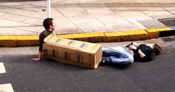 Al otro se lo notaba muy mareado y le costaba bastante mantener el equilibrio, sin embargo se las ingeniaba para esconderse en una caja de cartón y acostado en el piso asustaba a los distraídos transeúntes.