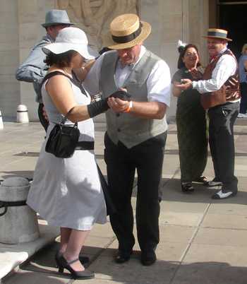 Señores con rancho de paja y pantalones con tiradores, algunos fumando pipa y las damas con capelina, algunas sombrillas de encaje e incluso hasta algún vestidito charleston y medias red con ligas. Una maravillosa recreación.